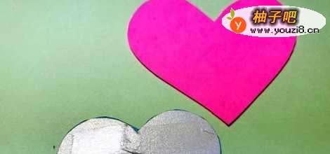 3接着将红色的大爱心分别粘在硬纸爱心的两面,一共有3个爱心组合在一起,如图所示。