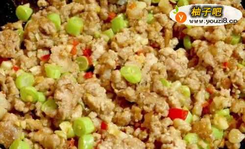 2绞肉先拌炒至变色焦香后,再把绞肉挪至锅子边,把蒜末、辣椒、四季豆放入一起爆香。