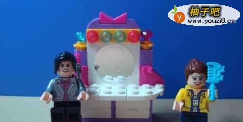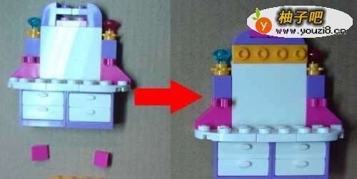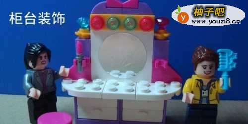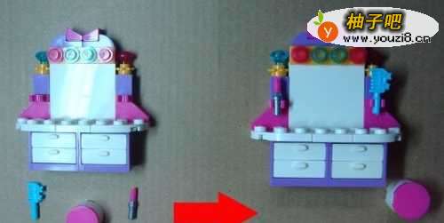5然后拼装柜台的椅子部分。由两个零件积木所组成。拼装好了把化妆柜摆放好,位置。如下图所示。