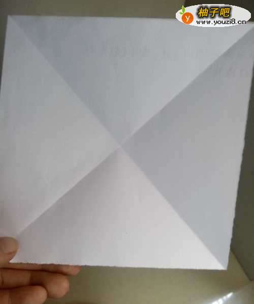 将方形纸张进行对角线对折。展开之后,另外一个对角线按照相同的方式操作。