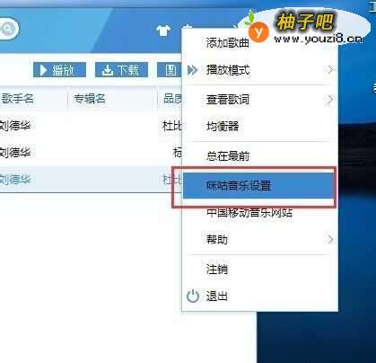 4在弹出的下拉菜单中,点击“咪咕音乐设置”并打开其属性框。