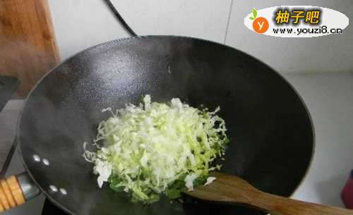 2圆白菜切丝,韭菜切段,小葱切碎,姜切末。圆白菜我用了小半颗,大约200g,韭菜没称量用了6根。小葱和姜就是平常炒菜的量。