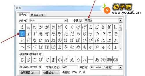 4在“子集”中选择“平假名”,并在下方选中平假名じ,点击“插入”。
