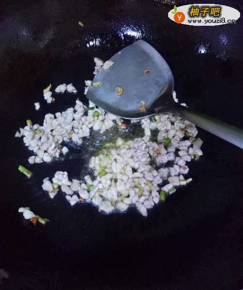 3到入肉末,翻炒至肉变白色