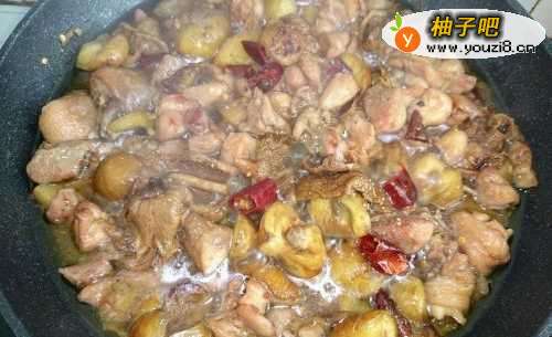 4下入煸炒过的鸡肉(记得不要将油脂倒入),再放入板栗和调味料钢球,(如果汤汁没有淹没过原料可以适量加点开水),大火烧开小火焖20分钟后放入大蒜, 再依据个人口味加入盐等调味;