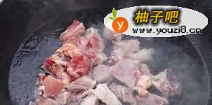 锅中放入适量的油, 下入焯过水的鸡肉煸炒