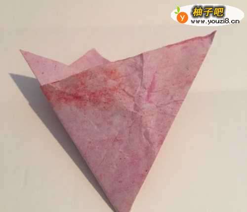第一步 把一张16厘米x16厘米的红色彩纸 从下向上对角折叠