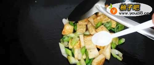 4热锅倒油,放入大葱段煸炒出香味后,下入煎好的豆腐块,翻炒几下。
