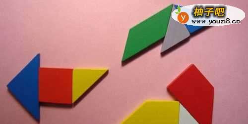 6最后,取蓝色的三角形板与红色的正方形板连接,并摆放在橘色梯形板的下边,拼接位置,如下图所示。这样好看的仙鹤图形就拼好了。可以让孩子仔细看一遍后,自己动手拼图,并不断回忆拼图的顺序,这可以锻炼孩子的记忆能力。培养孩子的过目不忘的能力,对孩子以后的学习有帮助。