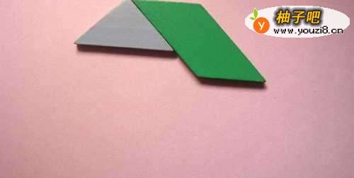 2先取紫色的三角形板与绿色的平行四边形板连接,摆放在纸上,拼接位置,如下图所示。