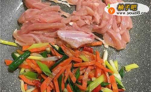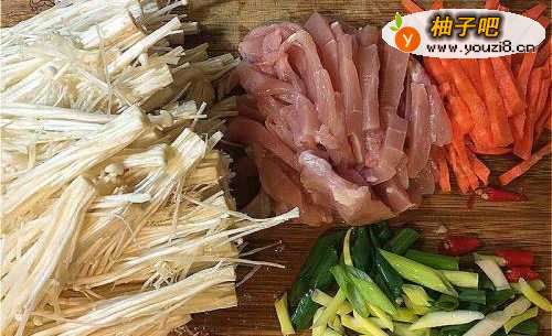 将鸡胸肉和红萝卜切丝,金针菇、葱和辣椒切段。