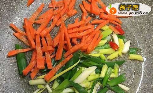 2锅里放油炒香葱段、辣椒、红萝卜。