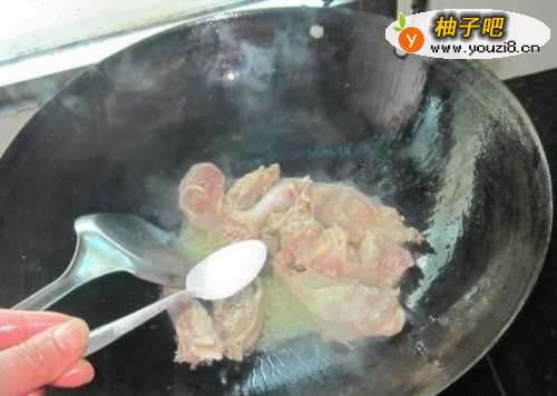 3置锅于灶上,放少许调合油,油温八成热时,放入老姜片与码味后的鸭腿块下锅同炒。