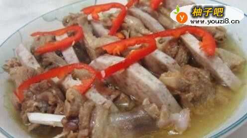 8蒸约50分钟左右,断电保温,约焖十分钟,取出碗,将备用的红椒丝撒些在芋头和鸭腿块上配色,即成。