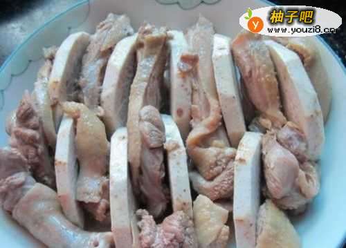 2鸭腿切块,用少许盐、胡椒粉和料酒码味;同时将芋头切成约0.5-0.8cm厚的半圆块状。