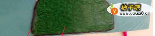 首先用一张浅蓝色的纸张为底——找到一条黑色的毛衣线——然后把黑线做成一个椭圆——接着用青绿色的毛衣线在黑色圈内摆放整齐,铺满整个椭圆,这样就做好了草地图案。