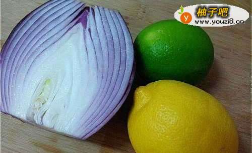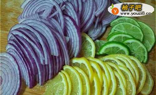 2把洋葱和黄柠檬、青柠檬各半个切片。