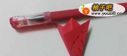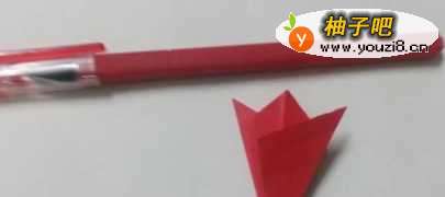 4展开,把右边的角折到左边然后再折回来,如图所示。