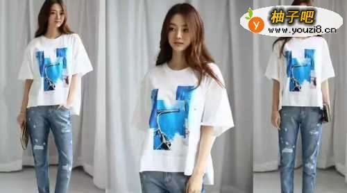 10如果非要穿T恤,记得挑选有印花图案款,这样的T恤惹眼又时尚,下面搭配一条宽筒破洞牛仔裤就OK,宽筒裤搭配必翻脚边才够潮,鞋子可往休闲类搭。