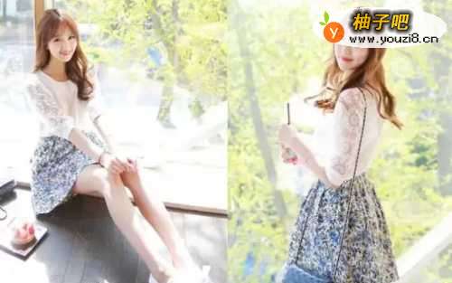 7一件白色雪纺套头衫,袖子拼接蕾丝设计很有淑女味,下搭花纹褶摆裙,将淑女甜美升级,变得清新脱俗,妩媚迷人。