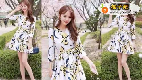2一条裙子,裙身印满黄色花纹,款式腰带系蝴蝶结收腰设计,使穿着更有曲线,下摆褶裥露出美腿,随意搭配平底鞋,简洁时尚美。