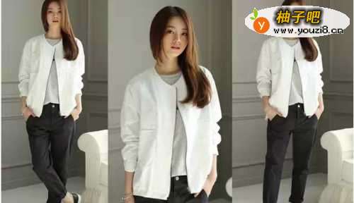 6一件白色外套,一条灰色T恤衫,一条黑色休闲裤翻脚边,搭配一双黑色平底鞋露脚裸,就非常简约时尚,还帅气美丽。
