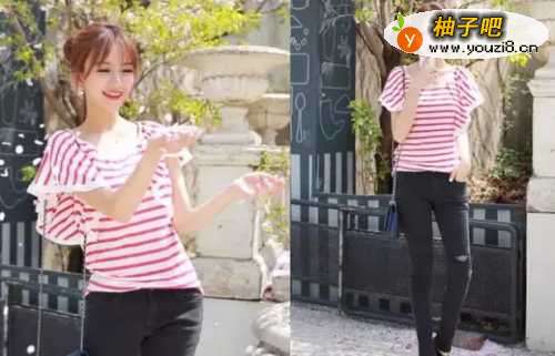 8一件玫红条纹上衣,宽袖筒自然褶皱形成美丽花纹,下穿黑色紧身牛仔裤和厚底鞋,这样搭配非常简单,又有青春美丽感。