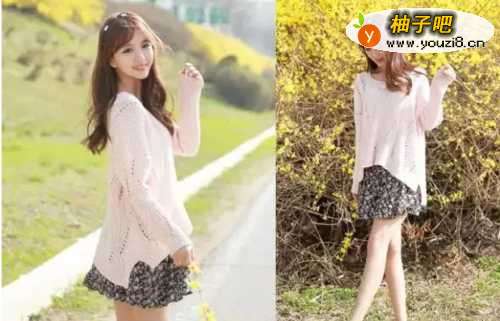5一件粉色毛织套头衫,款式漏针织法十分凉爽透气,下搭花纹小摆裙,面料轻薄丝滑穿着舒适,脚搭同上衣色系平底鞋,突出清新淑女范。