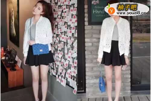 9一件白色破洞外套,只是春季时尚的装饰,天热脱下外套露出灰色打底衫,下搭黑色小短裙。形成黑白灰三色系混搭,色调搭配简单又不容易出错。