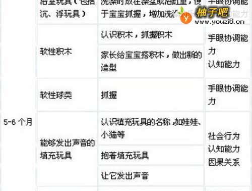 5-6个月的宝宝,家长要开始锻炼他们的手眼协调能力。这个阶段,宝宝可以准确地把手伸向玩具,而且还能够做出一些简单而有效的动作,甚至可以记住不同玩具的玩法和功能,玩具掉后也会顺着方向去看,甚至可以同时抓住两个玩具,软性积木玩具就是家长比较好的选择。