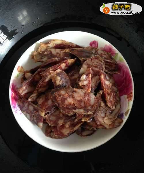因为香肠是自己家里事先晾晒好的,所以蒸香肠这倒菜很简单。只需把香肠洗好切好并装盘。