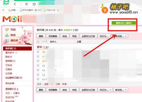 7最后,这些被我们打上勾的邮件就被删除了,当系统删除完成后可以在页面中看到几秒的删除成功提示。