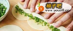 4取3张饺子皮,依次排好,连接处略微重叠,涂抹上薄薄的一层油酥,撒上葱花,我喜葱,放得有点多。重叠处可抹少许油酥,使得3张饺子皮不易脱节。