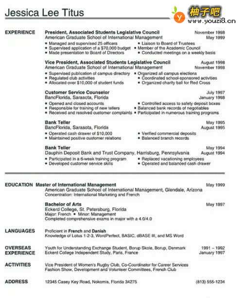 2.多参考国内简历排版,内容顺序等,进一步改成接地气的简历。下面例子是从网上随意截取的,可以看出由于文化、语言的不同,侧重点非常不一样。在美国简历讲究专业性、具体性和简洁性,一般都会用最正式的排版,直接了当的突出“我”的学业成果,“我”对社团等做出了什么样具体的贡献,尽可能在开头列出“我”最牛的全部点,力求让老板5秒内信服:这就是我要的人才。国内特别是本科毕业的简历,有一些走花里花俏的路线,美女头像和以量震撼人,这些见仁见智,反正基本的几个(教育经历,奖项和活动)都一样,我建议如非必要,可以坚持英文版的特点;当然单位喊你填下面那种统一的表格(你爹妈是谁,照片贴上。。。),就入乡随俗吧。