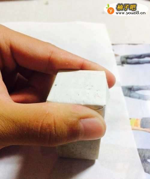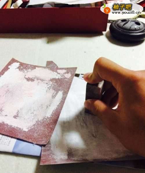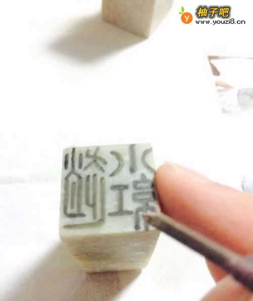 4用一点水浸湿宣纸,再用手用力按,使墨水印在印章上。