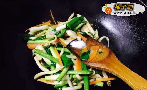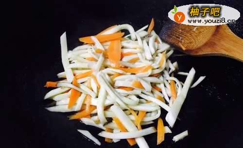 2接着锅烧热之后放入少许油,油热之后先把胡萝卜丝和杏鲍菇倒进去翻炒,翻炒到杏鲍菇变软即可。
