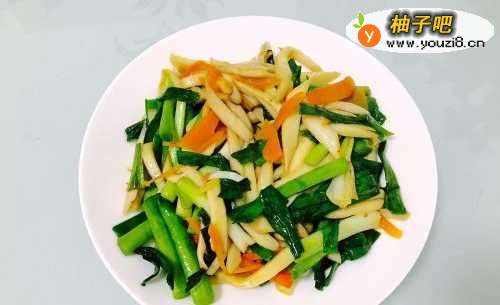 首先把杏鲍菇和胡萝卜去皮洗干净,青蒜去根去皮去黄叶洗干净,分别切成丝切成段备用!