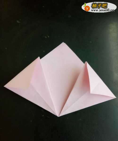 正方形纸,对折成三角形。把三角形的两个角往上折,变成图四。