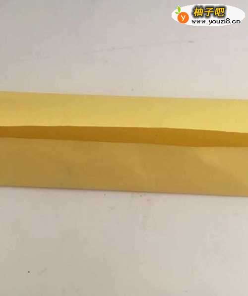 第一步 取一张16厘米长 8厘米宽的长方形黄色彩纸 把它平放 折从下向上对折再取开 然后上下两边都对齐中线折叠
