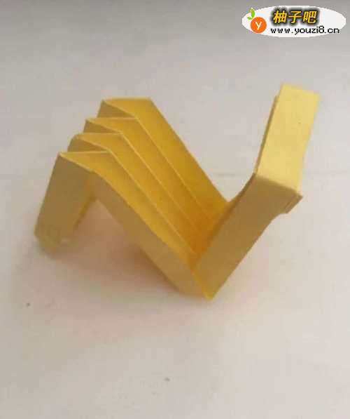 6第六步 加深折叠好了之后 把它拿起来慢慢把第一层向外拉扯 后面的一层向后拉扯 长出来的彩纸折一下
