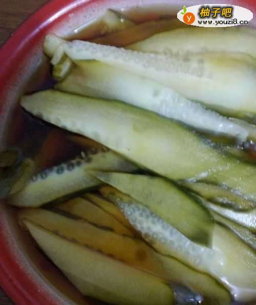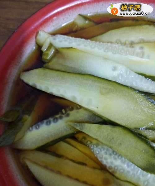 6再往青瓜里加入甜醋浸泡。加入少许白开水。喜欢甜的可以适当加些糖。青瓜酸嘢基本上做成了,只需再泡一会,迫不及待地尝一口,太美味了。