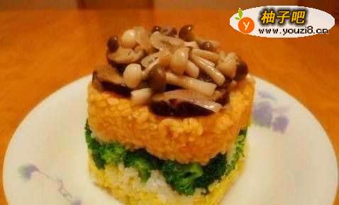 6最后码放:将混合成的三种不同味道的菜饭之一,放入一个保鲜盒中,按压之后放入第二种,直到第三种按压完毕,倒扣在一个盘中,最后在顶层放上已炒过的杂菇即成。