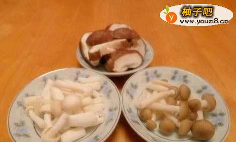 3准备好炒杂菌的材料:真姬菇、鲜冬菇、海鲜菇(洗净、去根部、切小)