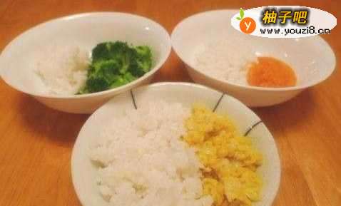 2红萝卜沸水焯下搅碎;西兰花沸水焯下切小朵;玉米隔水蒸熟用刀削下来,切碎。将红萝卜碎、西兰花碎及玉米碎分别与白饭混合。