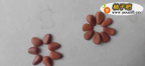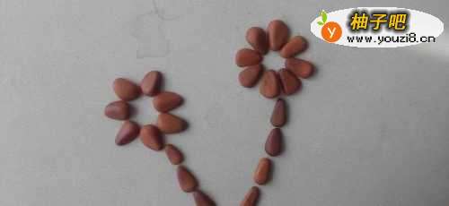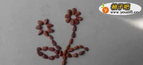 2用细短的松子壳拼出两朵花瓣,可以一个花瓣松子壳尖端向外,一个钝断向外,位置错落有致。