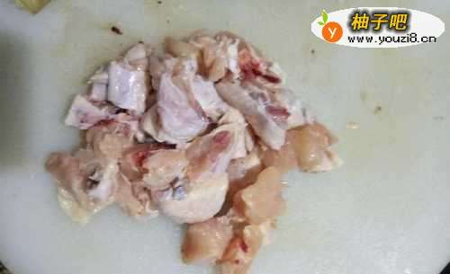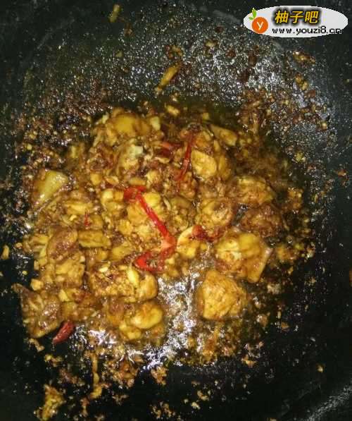 5再将鸡块倒入锅里翻炒,一直翻炒到熟为止;炒的油温要高,才不容易粘锅;
