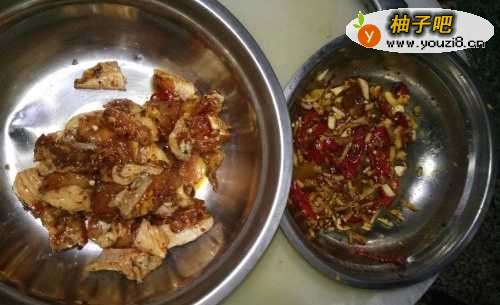 3待腌制时间到后,将鸡翅挑出,蒜头、姜丝、辣椒面等留着备用;