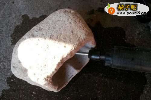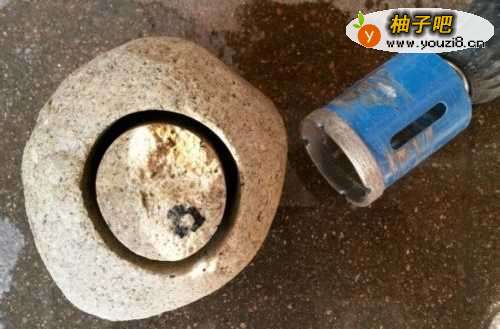 2挑选没有裂缝的石头,平坦的一面向下,作为花盆的底部。可以使用虎钳将石头固定住。根据石头的大小,选择对应的开孔器装到金刚钻上面,在石头上钻出花盆开口的大小,如果花盆较大,可以多钻几个孔。注意控制深度,不要将底部打穿了。