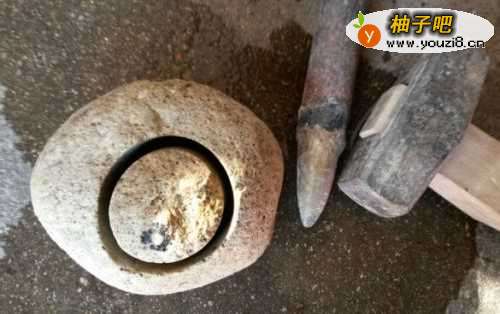 3使用合金凿和锤子将钻出来的孔敲开,这个比较费劲,还要小心翼翼,以免将石头敲碎,可以在石头底部垫一块橡胶片或废旧的轮胎片缓冲一下。