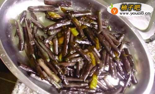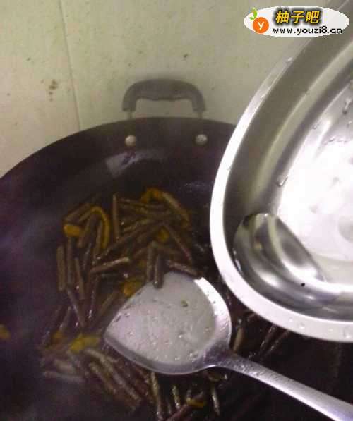 4把锅烧热,放油,然后把红豆角放地锅里,翻炒两三分钟,如下图所示。